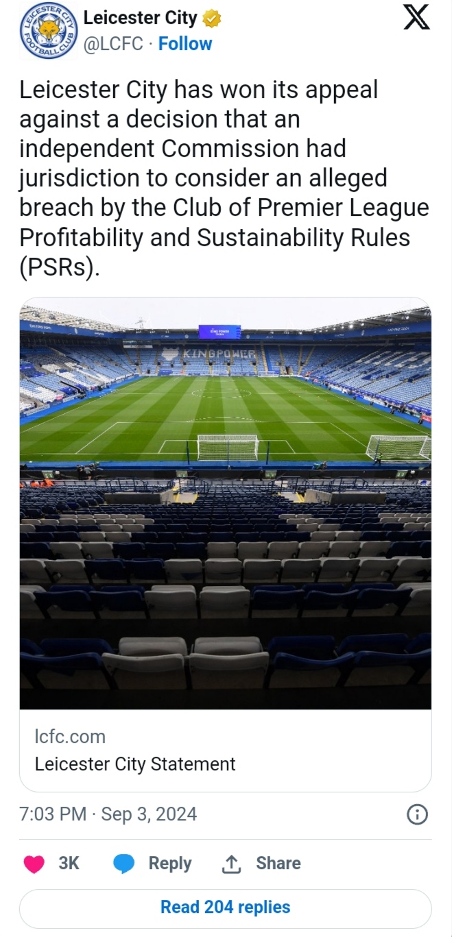 “To avoid any misunderstandings which may arise in light of the statement issued by the Premier League in response to the appeal decision, Leicester City wishes to emphasize the finding of the appeal panel that, when considering the wording actually used in the Premier League rules (in accordance with established principles of English law), the club did not breach the Premier League PSRs for the assessment period ending 30 June 2023.