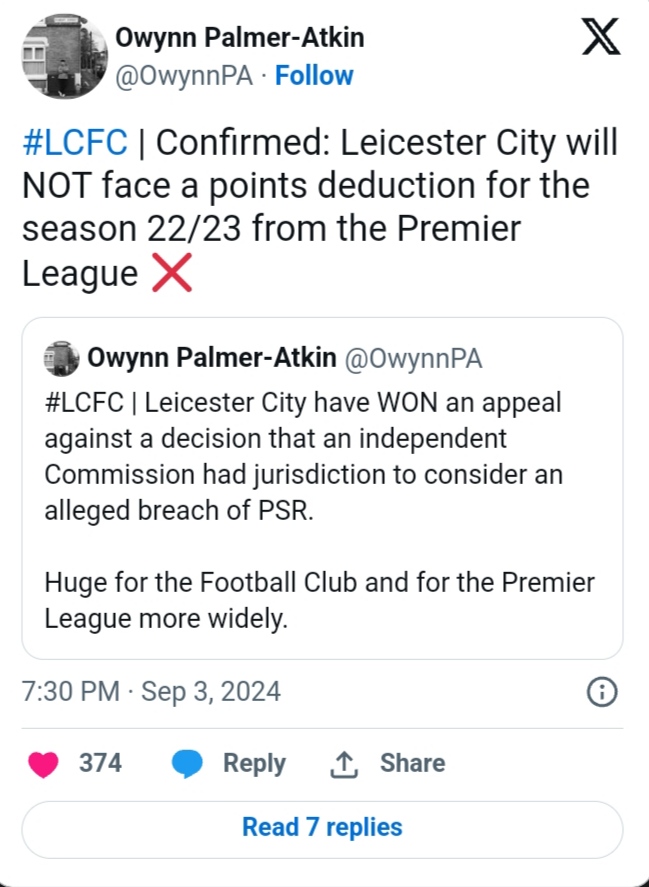 According to Martyn Ziegler of The Times, this outcome means Leicester “will escape any threat of points deductions.”