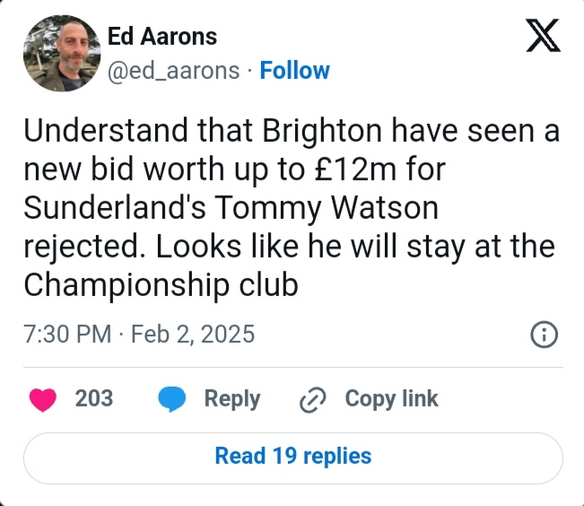 Despite this, Sunderland swiftly rejected the bid as they focus on securing promotion to the Premier League.