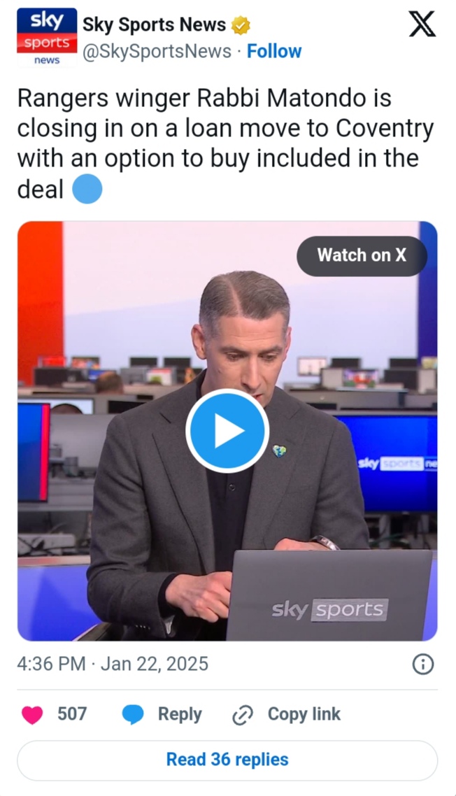 Rangers forward Rabbi Matondo is nearing a loan move to join Frank Lampard’s Coventry City with an option to buy, as reported by Sky Sports News.