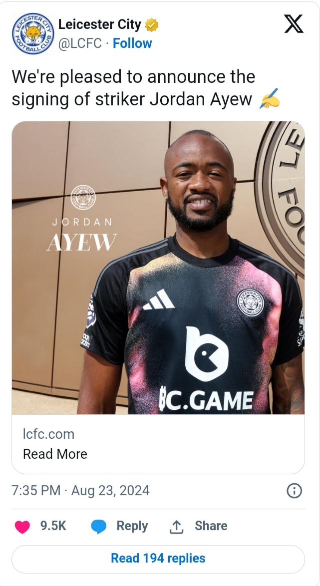 Leicester City has signed Ghanaian forward Jordan Ayew from Crystal Palace, aiming to enhance their attacking options.