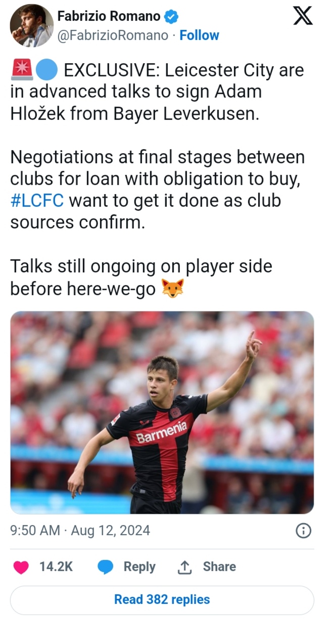 Fabrizio Romano has revealed that Leicester is in “advanced talks” to sign Bayer Leverkusen striker Adam Hlozek.