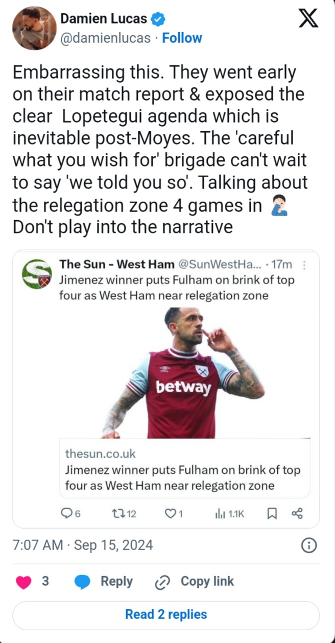 In their rush to publish, The Sun incorrectly reported that West Ham had lost the game.