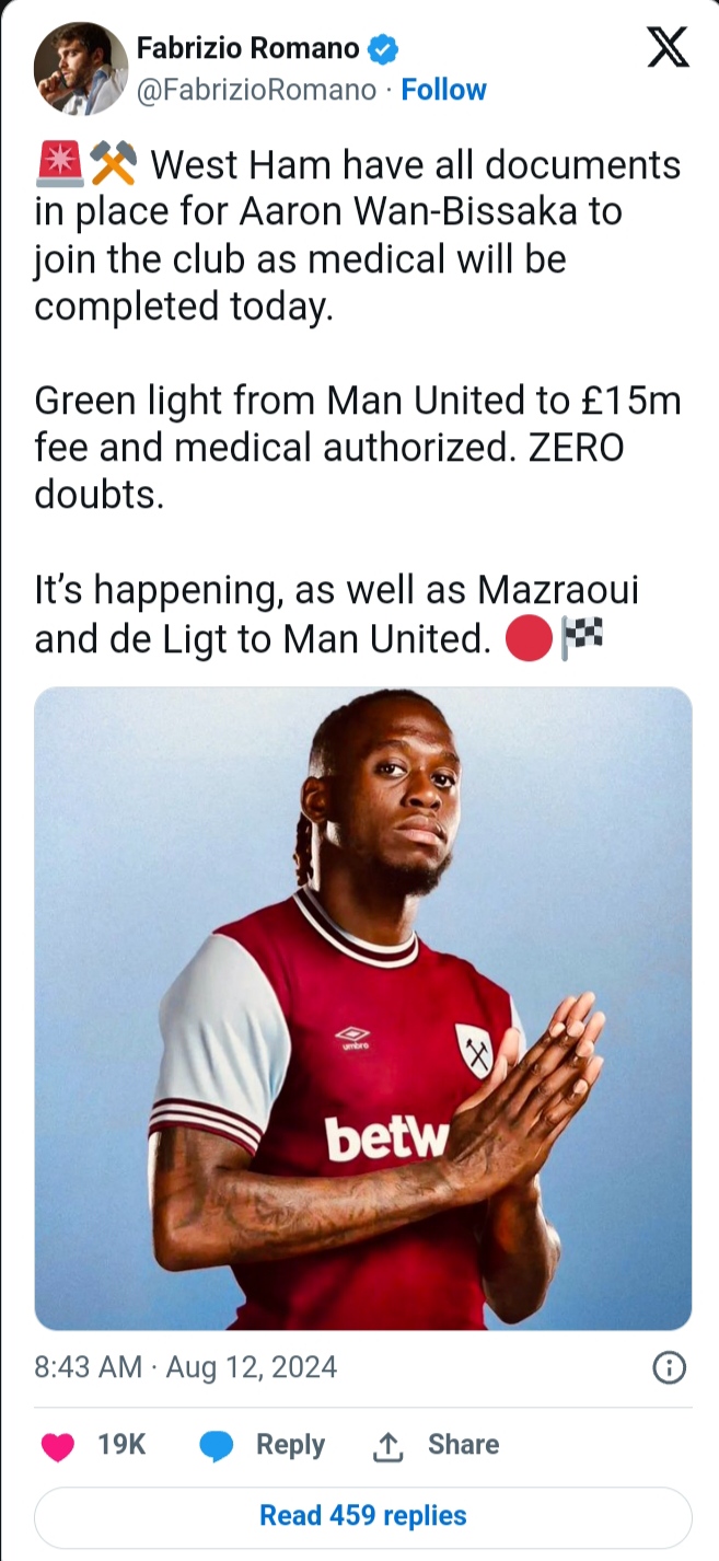 The Italian transfer specialist reported on his personal X account [12 August] that the 26-year-old defender will complete his medical on Monday 12 August after facing a delay on Sunday 11 August [Dharmesh Sheth].
