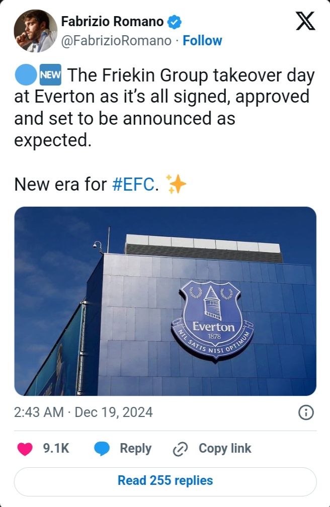 Fabrizio Romano provides key update as Everton takeover nears completion.