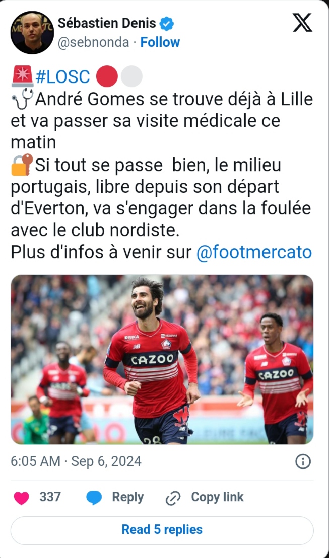 French journalist reported on 6 September that if his medical tests go well, 31-year-old Andre Gomes will sign for Lille.