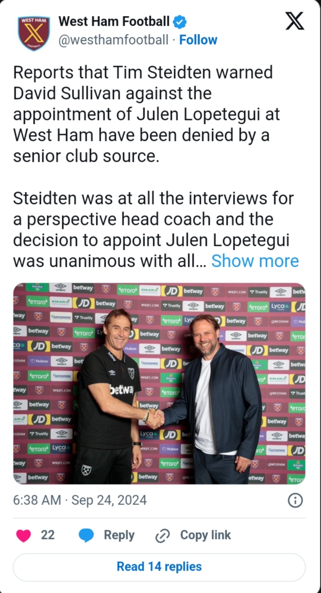 Whetstone reported, “Steidten was at all the interviews for the prospective head coach, and the decision to appoint Julen Lopetegui was unanimous with all West Ham stakeholders.”