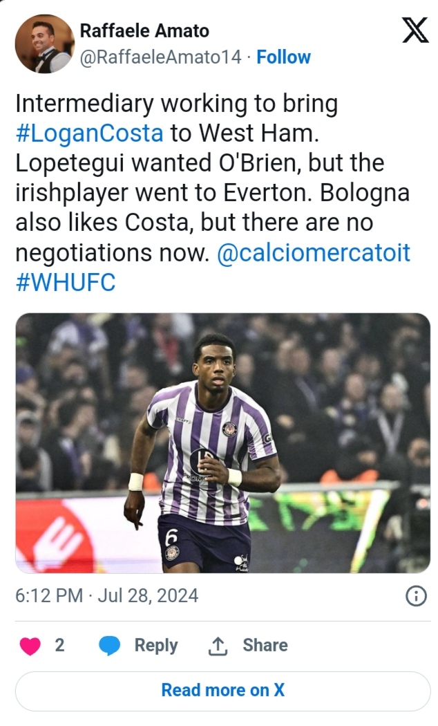 West Ham is now targeting Logan Costa, a centre-back from Toulouse, after missing out on O’Brien. Reports from Italy indicate that West Ham is in discussions with Costa’s agents.