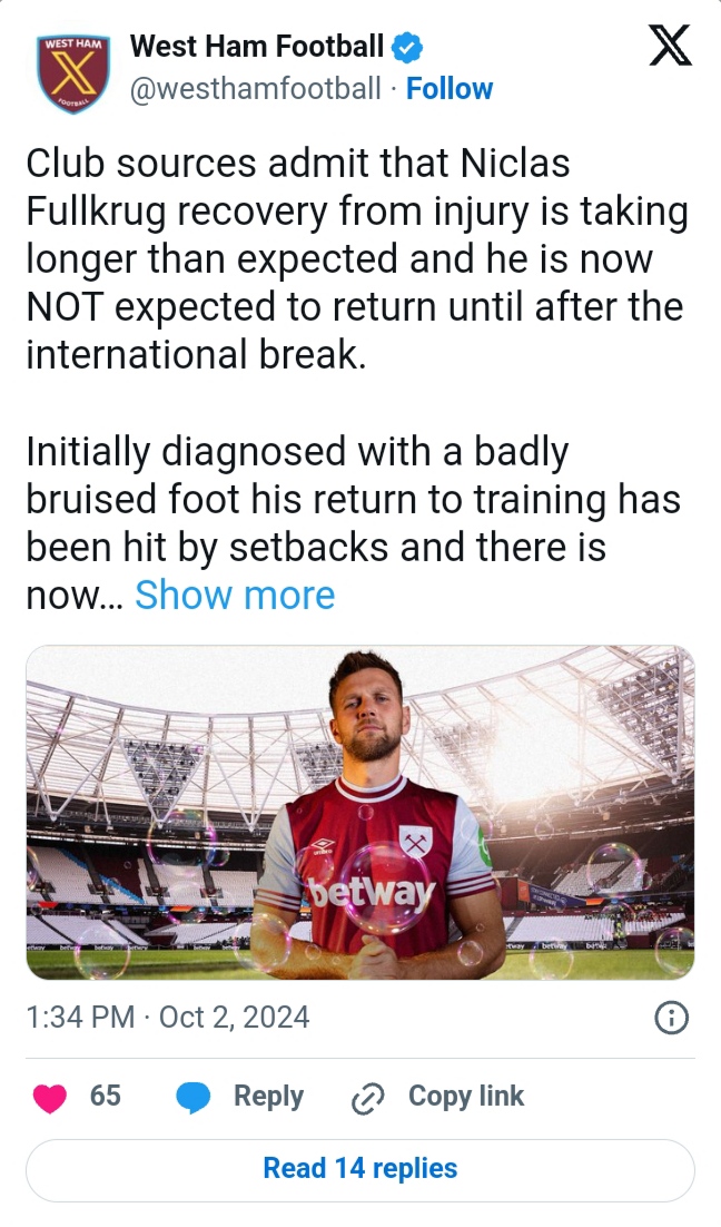 According to Whetstone, via the West Ham Football X account (2 October), German striker Niclas Fullkrug has taken longer than anticipated to recover from a foot injury and is expected to miss the upcoming match against Ipswich Town on 5 October.